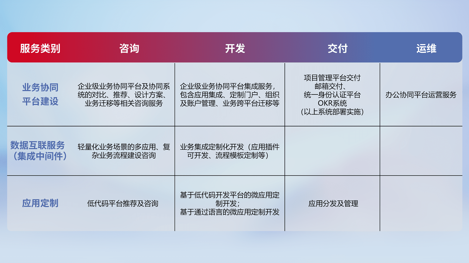 针对钉钉、、、、企微、、IDaas等平台级产品提供产品的规划、、、、方案、、、、交付、、、、定制化开发等服务,,,,实现如统一协同办公、、、、智能客户服务、、混合会议管理、、智能数据查询、、、等业务场景,,,实现数字化转型。。