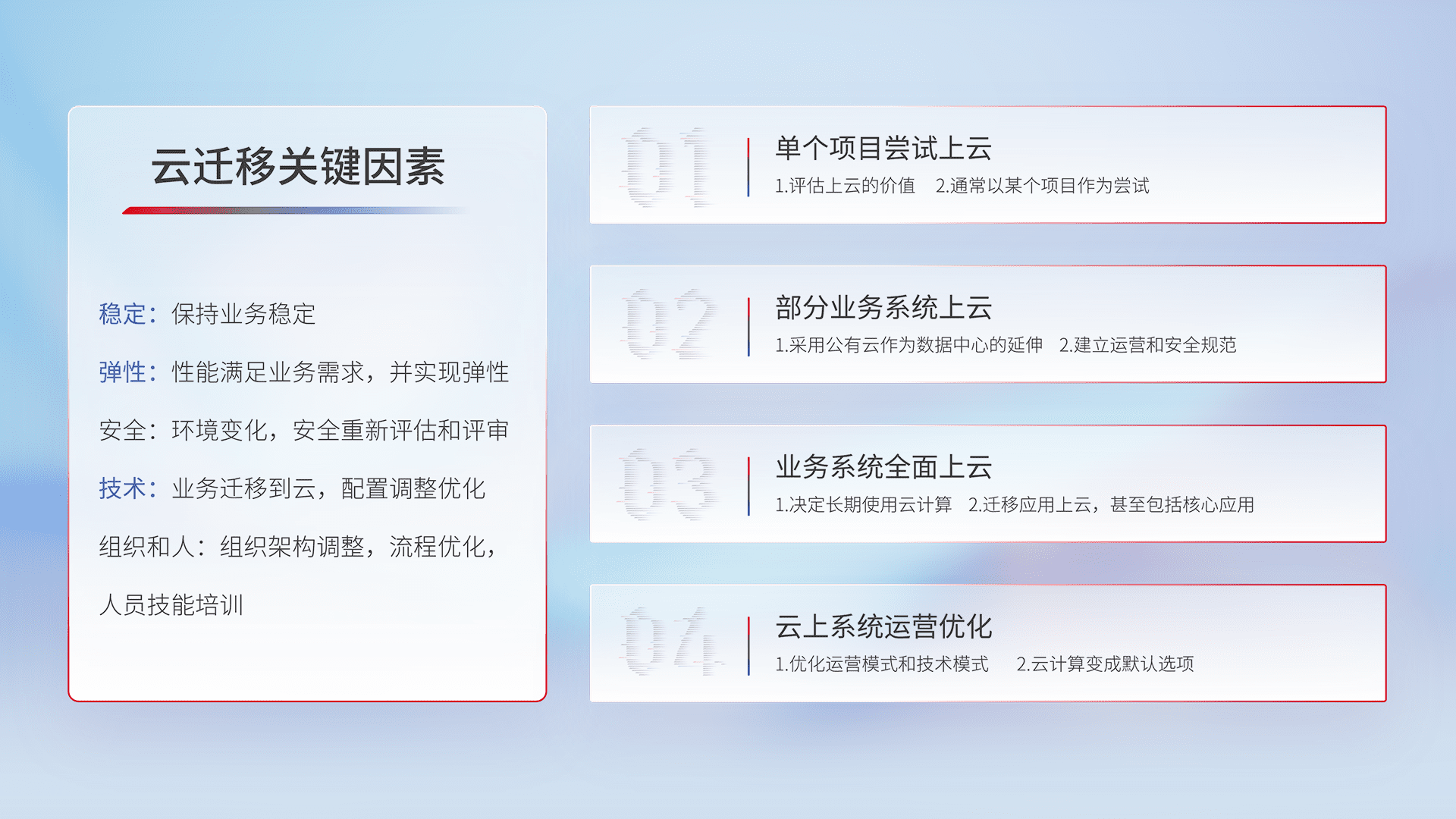 结合实际业务,,,,从规划设计、、云平台选型、、云原生改造、、、、数据迁移、、、集成交付,,,迁移全过程为客户识别最佳上云路径,,,做好风险识别管理,,,,设计网络架构、、身份权限、、安全审计合规、、操作审计、、、、日志审计、、监控告警策略、、多站点容灾设计等,,,,对云上基础设施进行整体规划,,,提升IT治理水平,,,以满足弹性、、高可用、、、、高性能的需求。。。