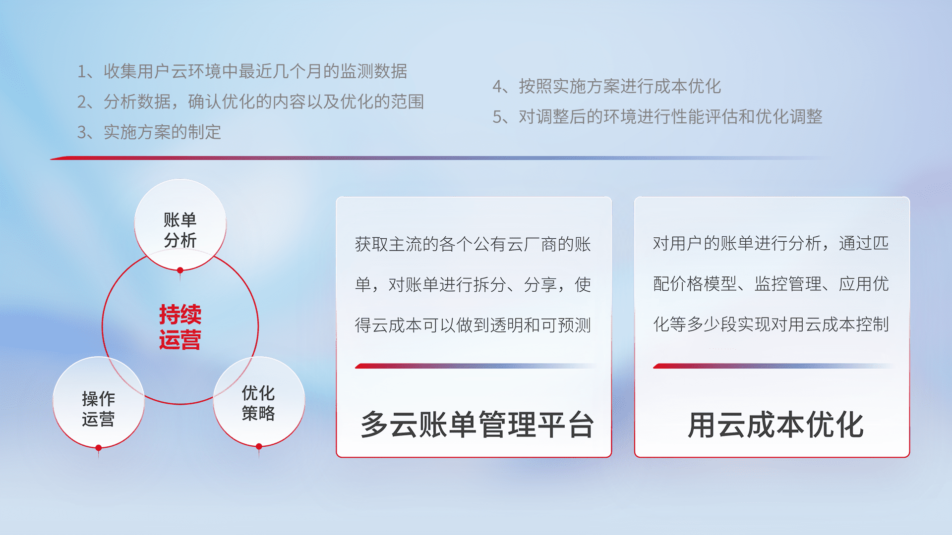 通过多云纳管,,以统一的资源数据模型把客户的云资源进行抽象和封装,,进而实现对多云资源的统一操作,,,保障云资源管理的可靠性、、、稳定性与可用性。。。量身定制化运维内容,,配置、、、、开发运维、、、、补丁管理、、、、备份、、、监控、、、、认证和访问管理、、、审计和日常巡检等,,,保障在用云过程中的可靠度,,,稳定度以及高可用率。。