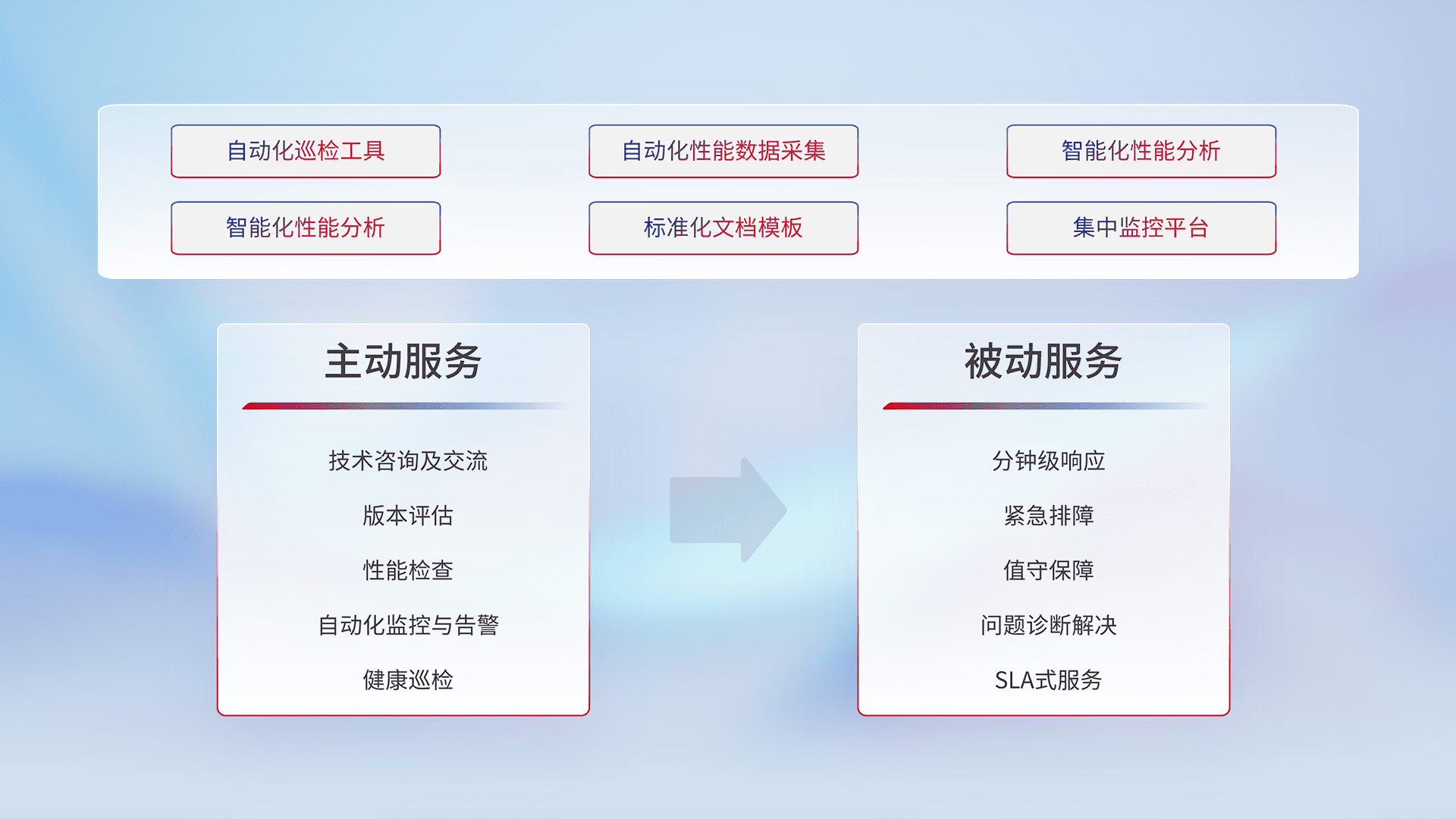 智能化工具和标准化文档,,,保障服务质量,,,,提供主动服务(包含技术咨询、、、、版本评估、、、、性能检查、、、自动化监控与告警、、、、健康巡检)和被动服务包含(分钟级响应、、、紧急排障、、、值守保障、、、、问题诊断解决、、、SLA服务)。。。。
